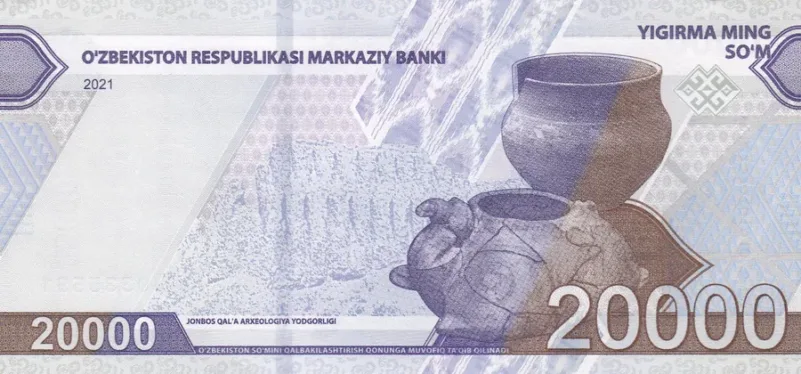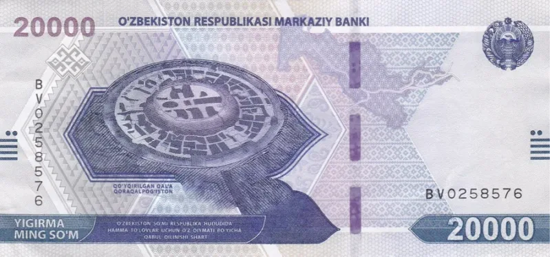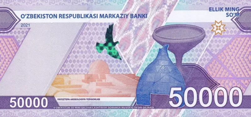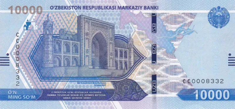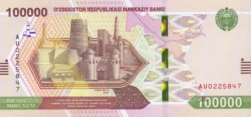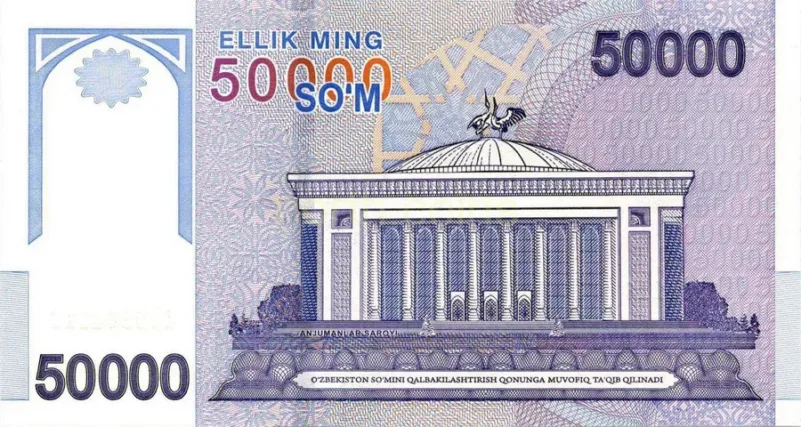 - Купюры: на банкнотах изображены памятники архитектуры, национальные орнаменты и исторические символы. Например, на купюре в 50 000 сумов вы увидите медресе Регистан в Самарканде.